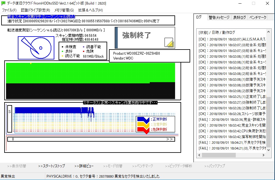 >>続いて、統計スキャンに関して気になっている点があるのですがこちらでは毎週1回必ず統計スキャンを行っているのですが時々、1回目の統計スキャン時においてはスキャン速度が速く、その結果、下のグラフ及び精度グラフが乱れてしまうことがあり、一度スキャンを中断した後、最初から統計スキャンを始めると今度はスキャン速度が遅くなり、同時にグラフも安定化するのですがどちらを信用したらよろしいですか。