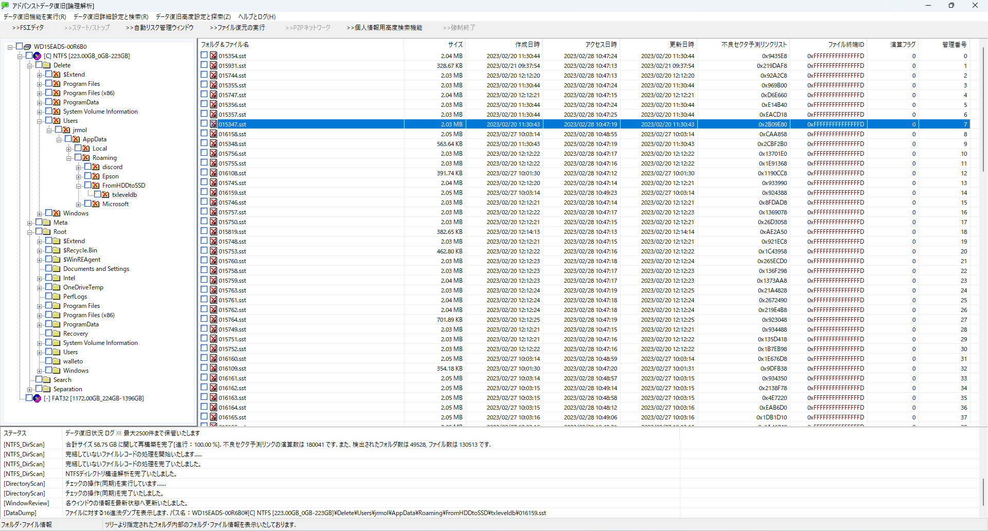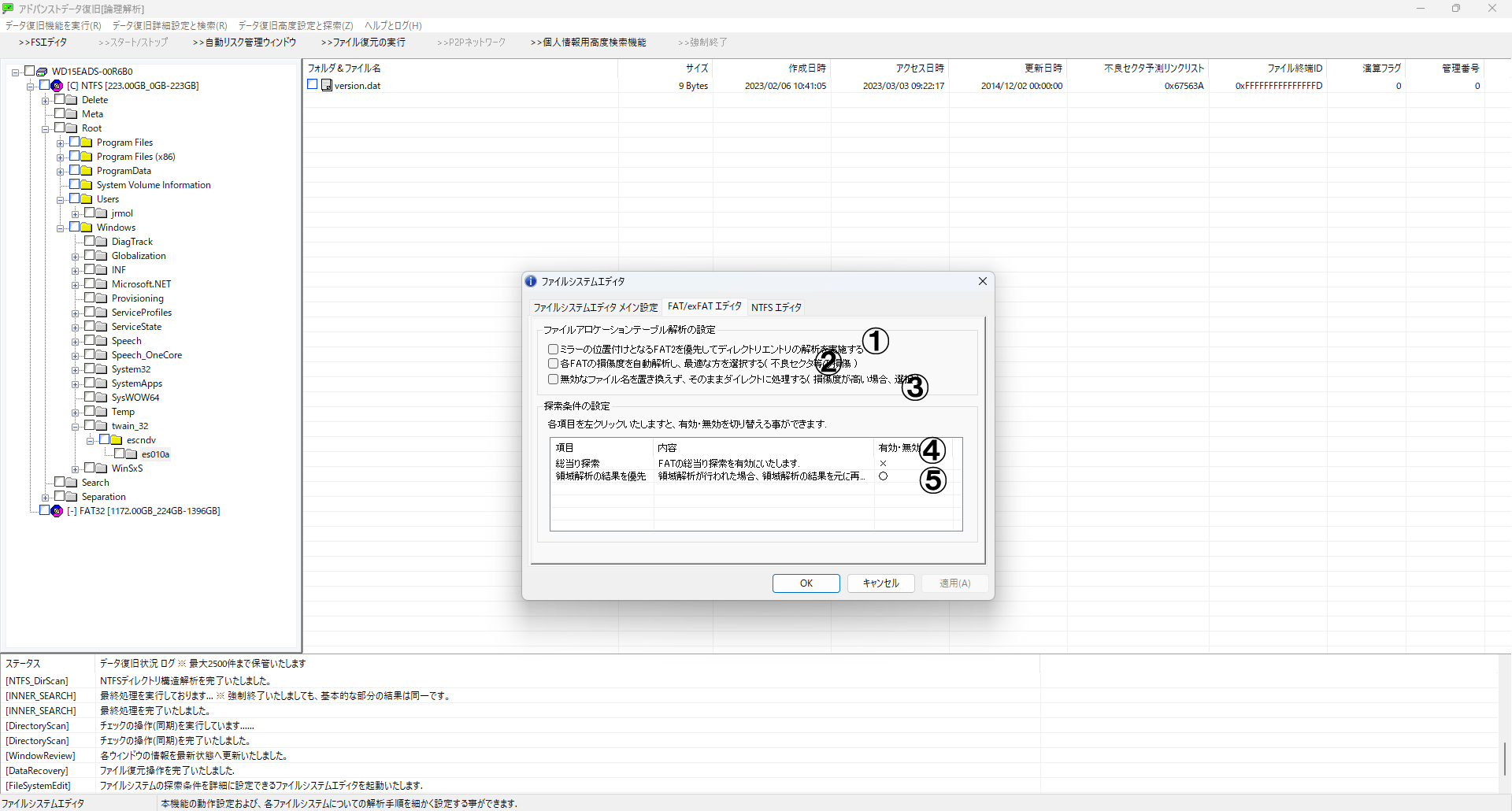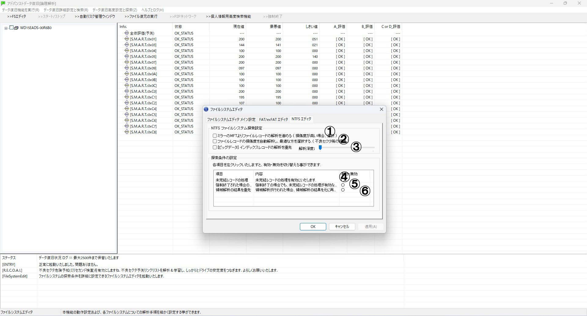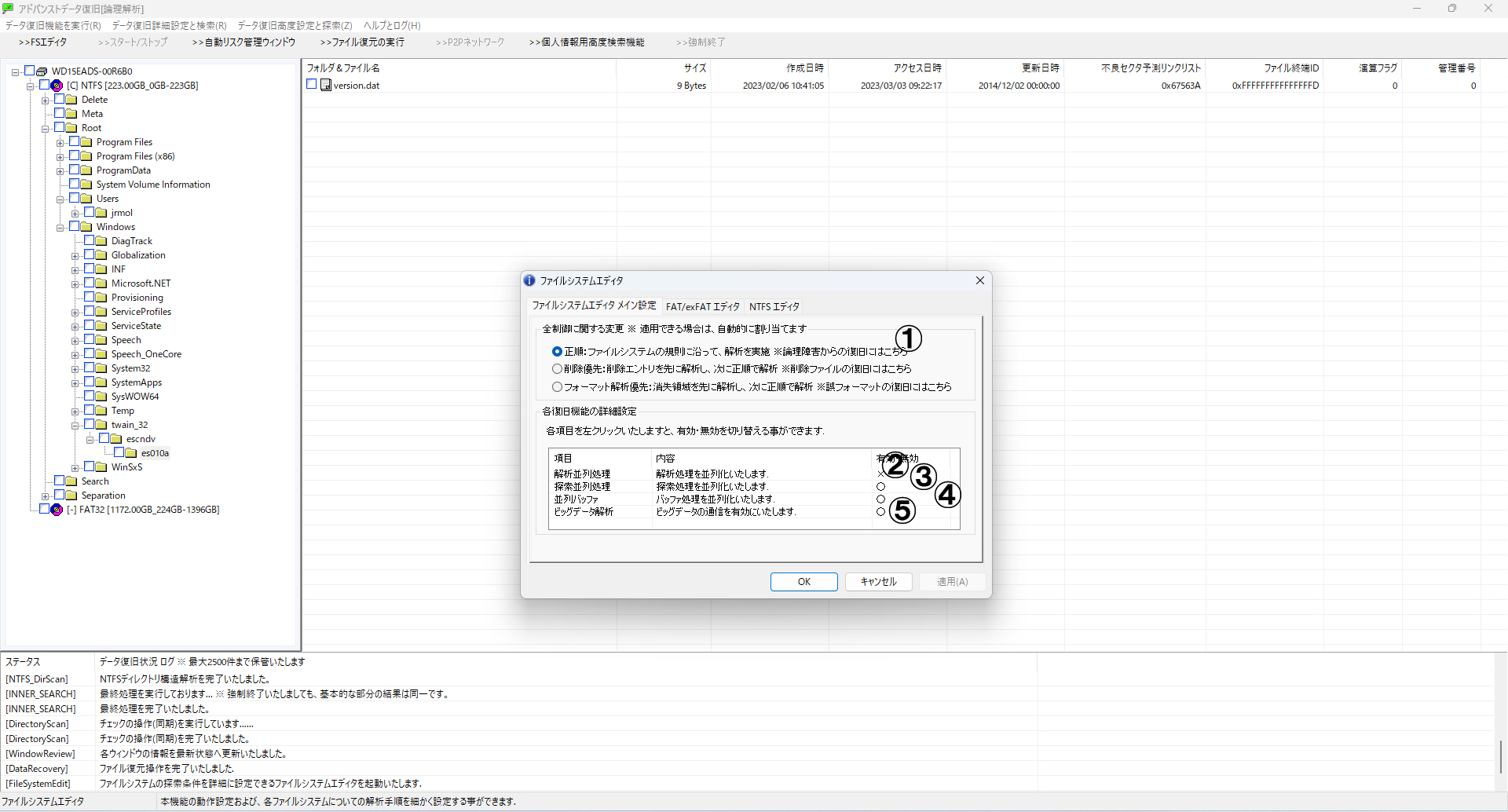 メニューより「完全・詳細スキャン設定」→「データ復旧:論理解析 アドバンストデータ復旧」 を選択します。対象ドライブをリストから選び、2番の「詳細スキャン」をクリックします。